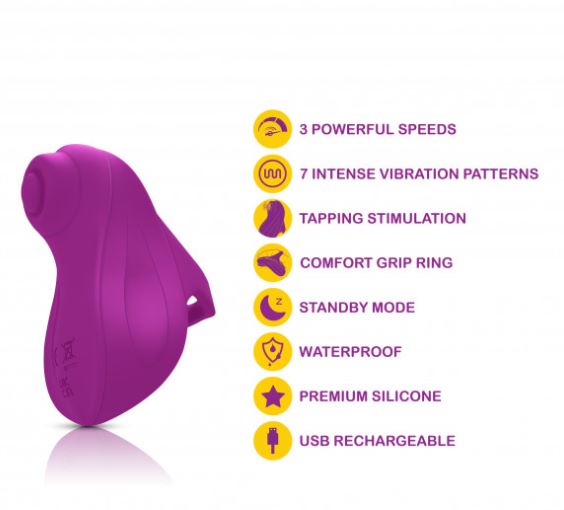 Powerful tapping finger-vibe, travel-friendly stimulator for couples and solo play. Ergonomic design featuring comfort grip finger loop. USB rechargeable, waterproof and made of body safe premium silicone. Easy on/off button control.