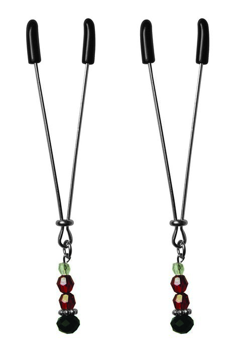 Delicate tweezer-like clamps fit to your specifications to create a pleasant intensity. Rings slide down the shaft of the tweezer clip for snug-as-you-like sensations that, making these accessories ideal for all experience levels and pain tolerances. Soft pads on the tips create the option of added comfort, but can be removed for more of bite. Sexy yet classy red and black jewels dress up basic clamps to beautify your devious intentions.